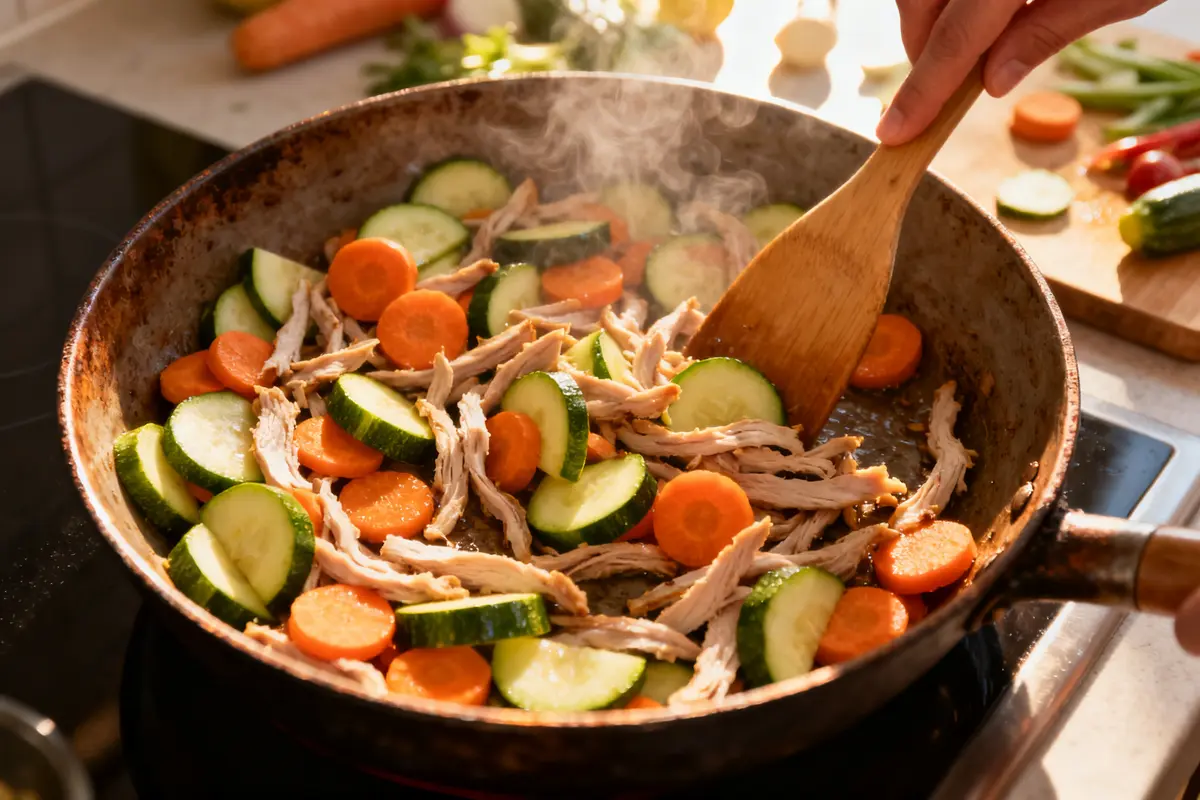 Pour gagner du temps, coupez les légumes en petits morceaux avant la cuisson. Quelques minutes à la poêle suffisent pour obtenir un plat complet et coloré. C’est idéal si vous souhaitez un repas rapide sans alourdir votre fin de journée.