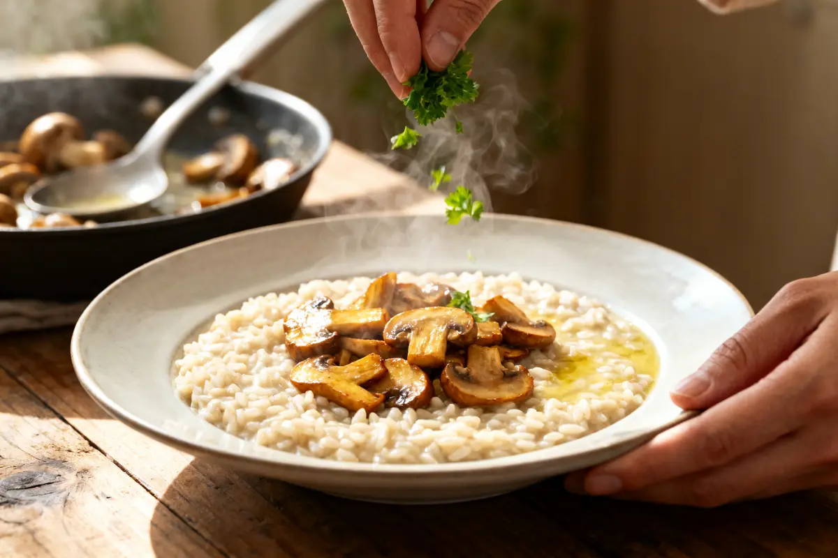 Servez dans des assiettes plates. Tapotez le fond pour que le risotto s’étale naturellement. Ajoutez le persil haché et les champignons sautés.