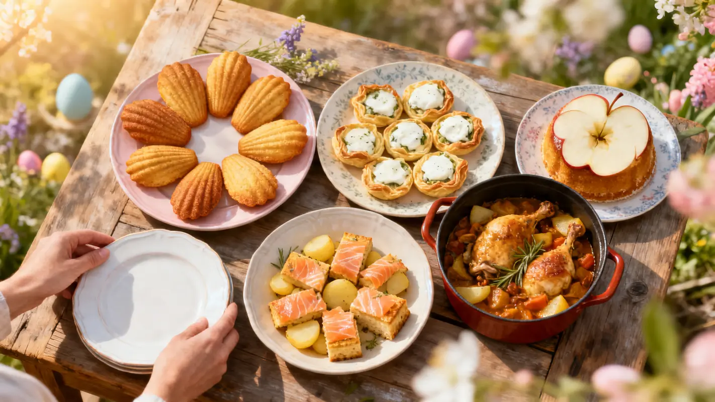 Voici enfin les cinq préparations qui permettent de composer un repas de Pâques complet, équilibré et sans prise de tête. Elles s’appuient sur des plats incontournables déjà connus : madeleines maison, feuilletés à la mozzarella, bricks au saumon fumé et pommes de terre, colombo de poulet antillais, et gâteau invisible aux pommes.