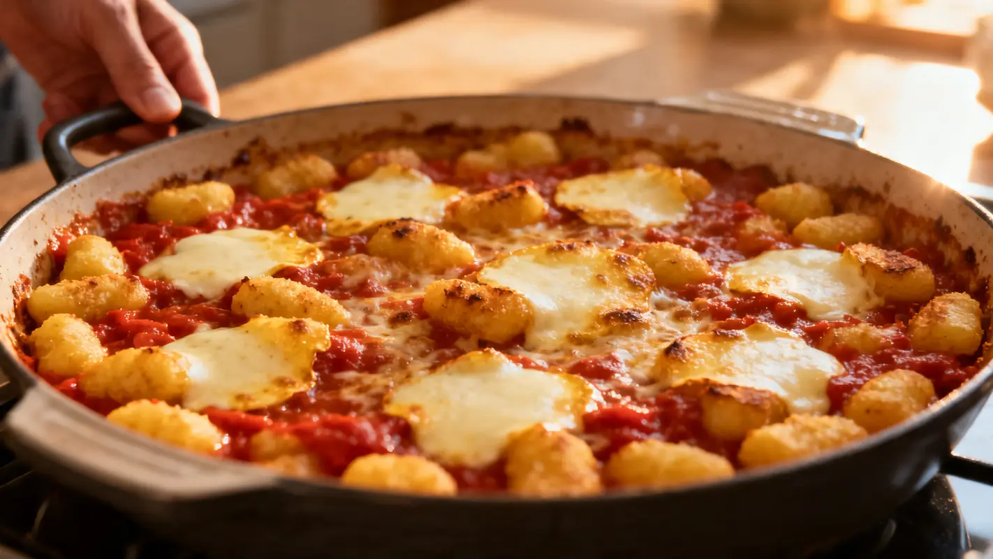 La clé tient en une petite audace : mettre les gnocchis crus directement dans le plat à gratin. Aucune eau bouillante. Aucun égouttage. Aucun risque de surcuisson. Ils absorbent la sauce à base de coulis de tomate pendant leur passage au four, ce qui donne un résultat incomparable.