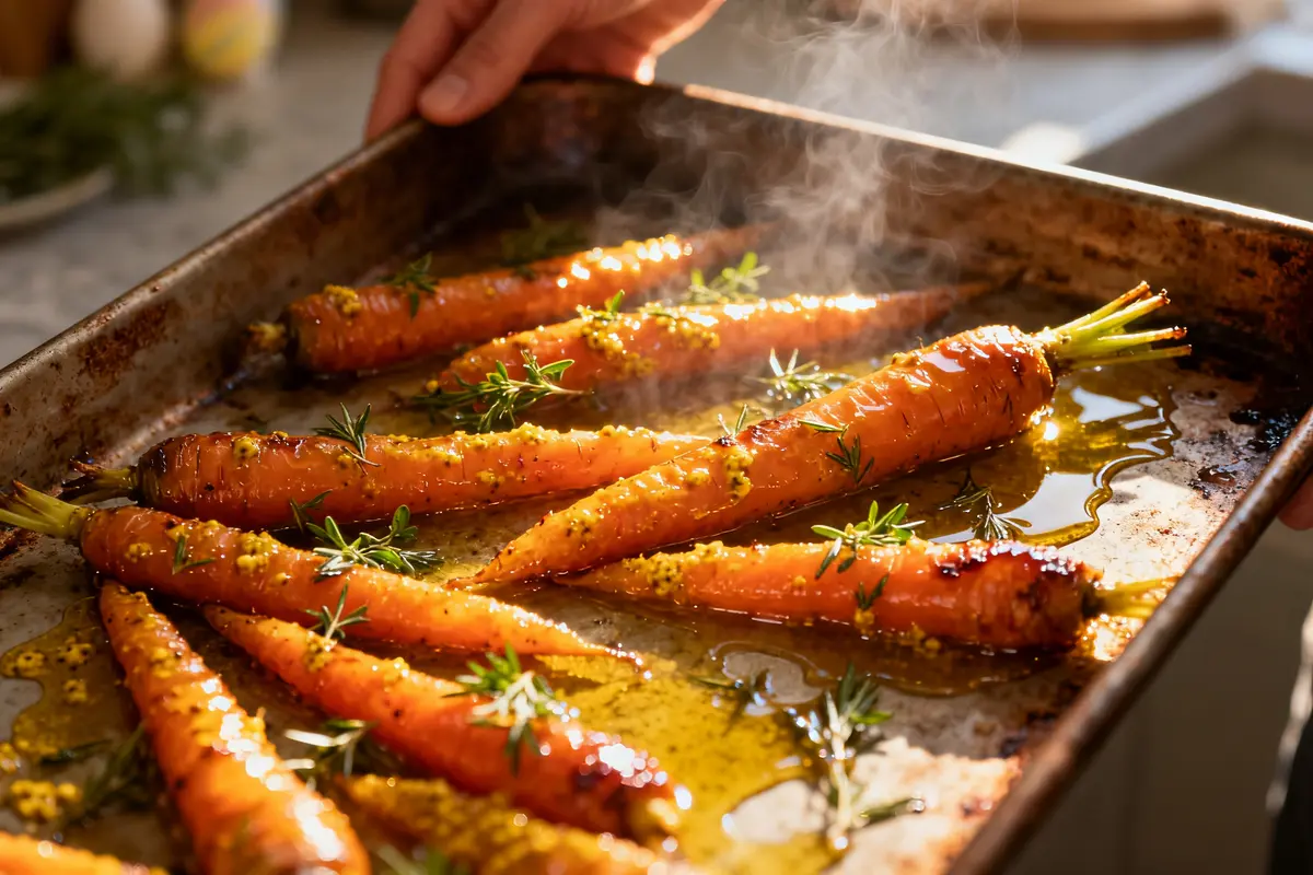 Les accompagnements de Pâques privilégient souvent les légumes doux, légèrement sucrés et faciles à marier avec l’agneau. Ici, la cuisson au four à 220 °C permet aux carottes de caraméliser en surface tout en restant tendres à cœur. Ce contraste donne un résultat très gourmand.