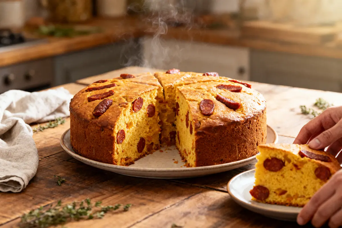 Ce cake au chorizo est l’allié parfait des journées pressées. Vous le préparez en quelques secondes dans le bol du Thermomix. La pâte devient lisse, le parfum du chorizo se diffuse et le résultat est moelleux, avec une saveur relevée juste comme il faut.
