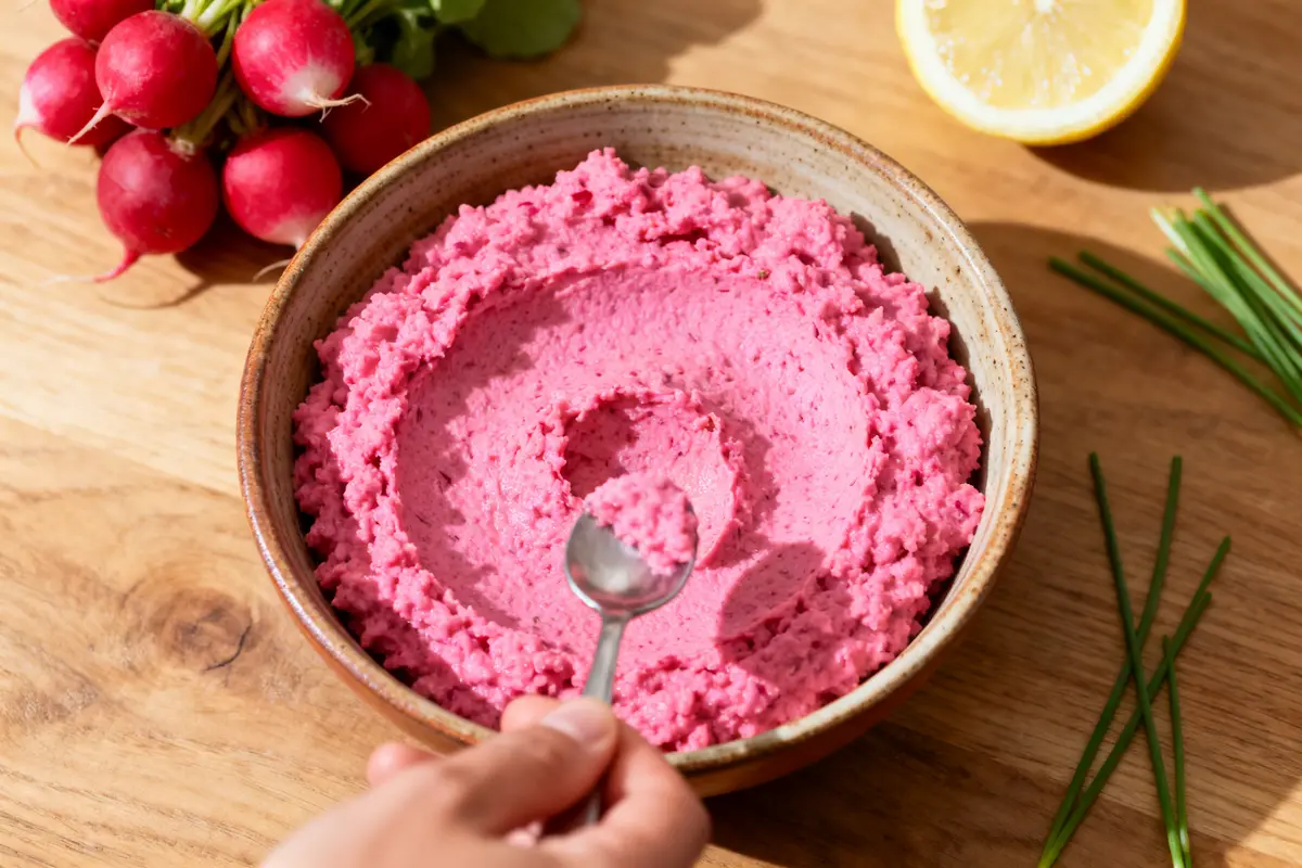 Mixer radis, betteraves et fromage frais. La betterave apporte une douceur terreuse qui enrichit la tartinade. Ajouter sucre roux, ciboulette et jus de citron avant un mixage final.